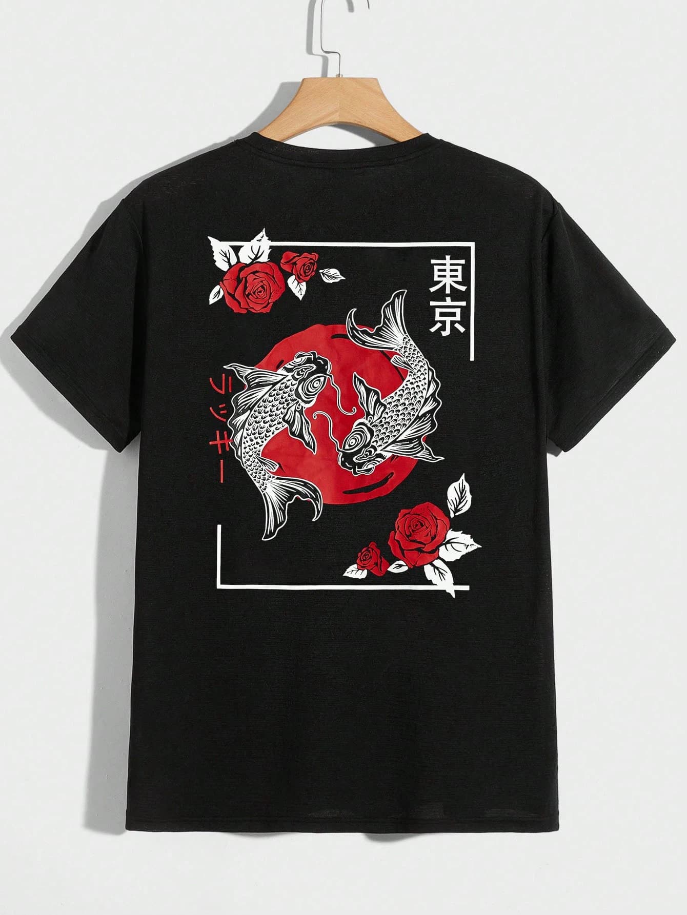 Tokyo Koi Koi Fish Rose Harajuku Prints T-Shirt Mens Hip Hop Crewneck T Shirts Cotton All-Match Short Sleeve Summer Male Man Top